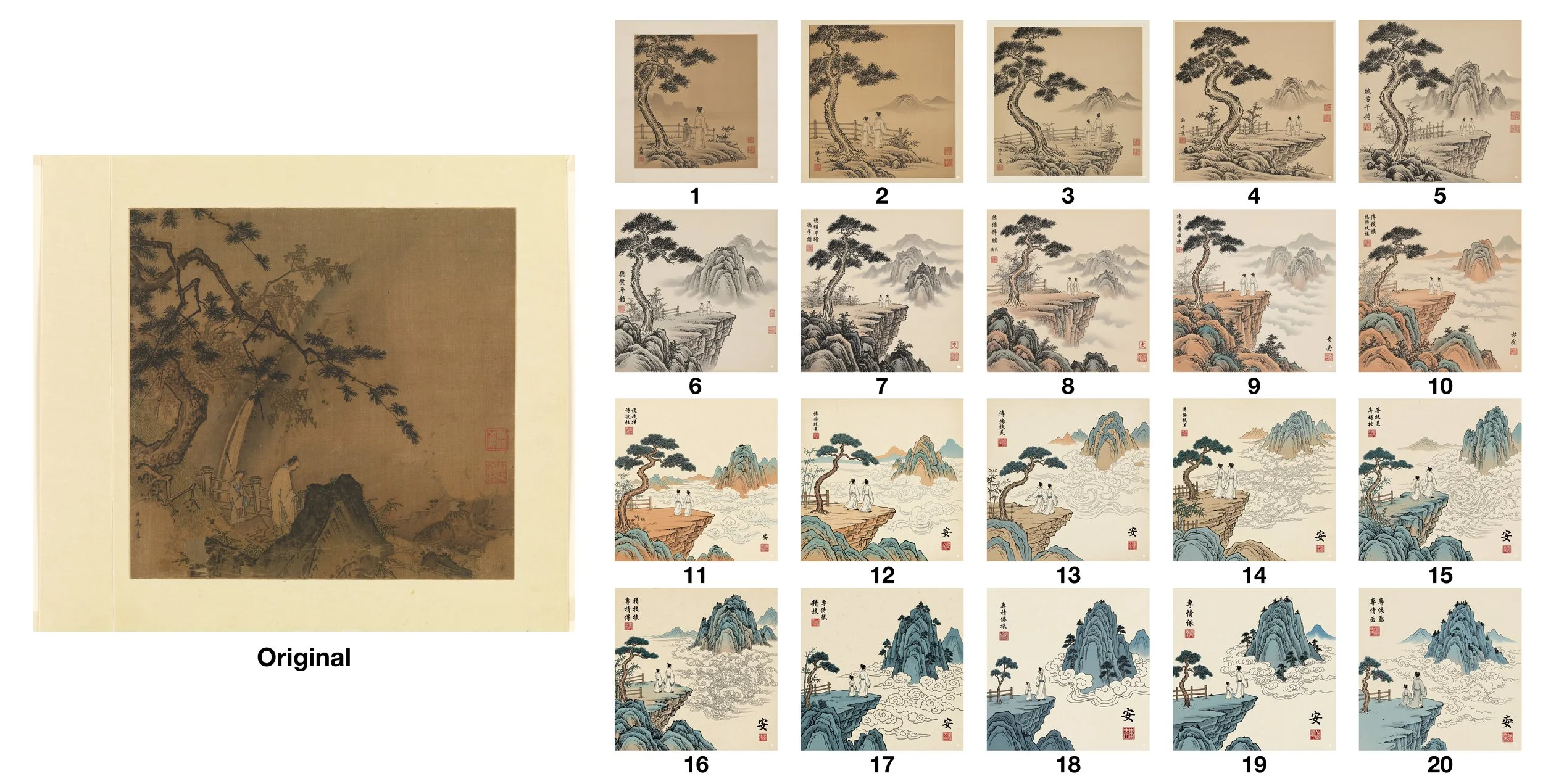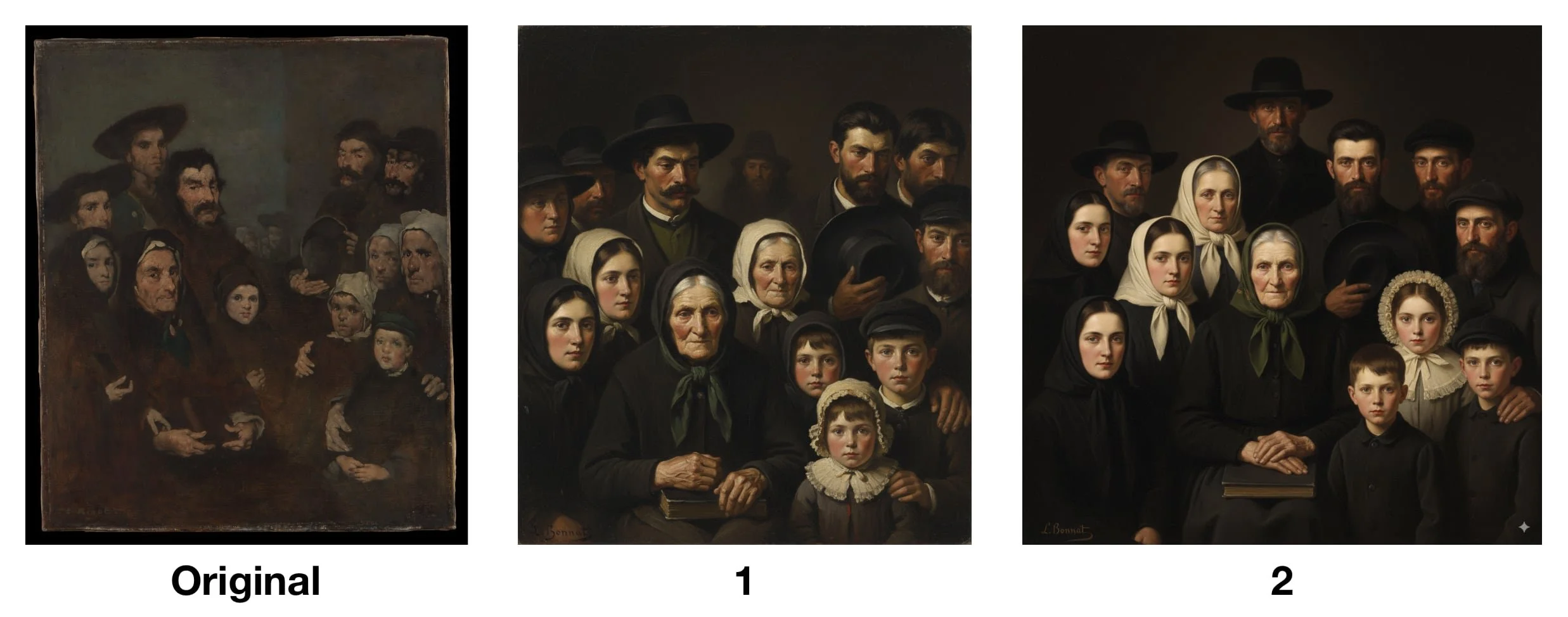 Using a prompt tuned for literal, high‑fidelity detail, I gave an artwork image to a multimodal LLM. I then fed the resulting description into an image generator to hydrate the “compressed” image. This image > text > image cycle can be repeated, iteratively compressing and re-generating.